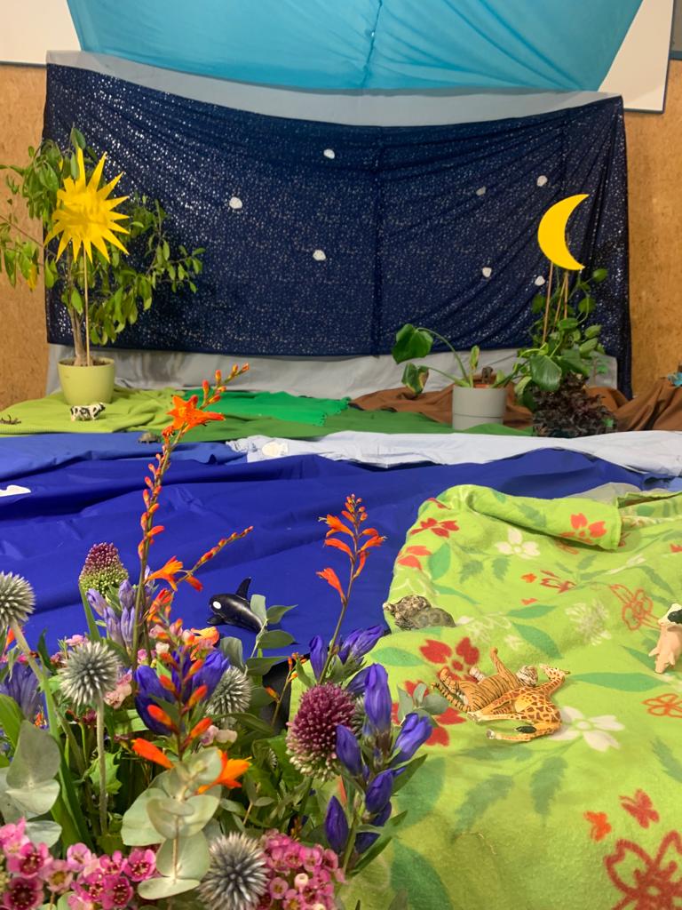 Nach einem leckeren Mittagessen gingen wir der Frage nach, was wir als Menschen eigentlich für eine Aufgabe haben: wir sollen uns um diese Erde kümmern, um die Umwelt, um unsere Mitmenschen und um uns selbst. Wie das konkret aussehen kann, da kann man unsere Vorschulkinder befragen. Sie hatten viele kluge Gedanken dazu. Für manch eine:n war der Tag so anstrengend, dass bei der Abschlussrunde die Kräfte fehlten, als wir die große Weltkugel im Kreis rollen ließen. Wir leben auf einer wunderschönen Erde, das haben wir heute festgestellt. Lasst uns tun was uns möglich ist, um gut auf sie aufzupassen!