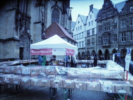 Mit widrigen Wettervorhersagen fand am 5. September unser Bücherflohmarkt auf dem Lambertikirchplatz statt. Die Planen schützten die Bücher gut und wir freuten uns sehr über einen überwiegend trockenen Nachmittag - und noch mehr über der das Ergebnis von 1500,96€! Dieses Geld können wir jetzt für unsere Arbeit mit den Kindern, Jugendlichen und Familien verwenden.