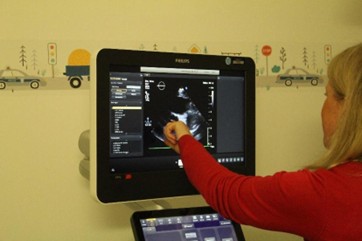 Anschließend ging es weiter zur Ultraschalluntersuchung. Auch hier gab es zwei mutige Kinder, die sich live untersuchen ließen. Auf einem großen Bildschirm konnten alle beobachten, wie ein Herz schlägt. Die Kinder sahen, wie sich die Herzklappen öffnen und schließen und wie das Blut durch die großen Arterien fließt. Dabei erfuhren sie auch einige wichtige Dinge über ihren Körper: Zum Beispiel, dass das Herz ungefähr so groß ist wie die eigene Faust. Außerdem lernten sie, dass Blut durch den ganzen Körper fließt und dass Bewegung und gesundes Essen helfen, das Herz stark und gesund zu halten.