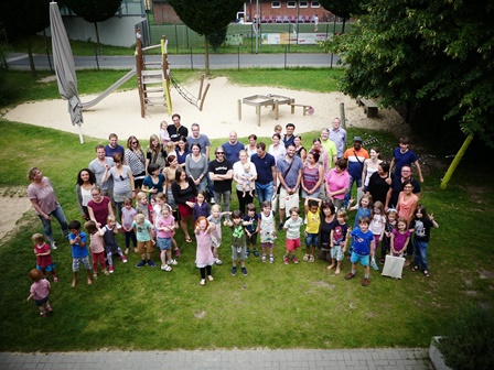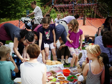 Alle Kinder waren in gespannter Erwartung auf den brühmten Wasserspielplatz, den wir nach einem ausgedehnten Zwischenstopp auf dem wunderbaren Kletterspielplatz auch erreichten. Das Wetter lies nichts zu wünschen übrig, als die Erwachsenen gemeinschaftlich ein reichhaltiges Picknick-Buffet ausbreiteten, während die Kinder schon im kühlen Nass planschten. Bei gemeinsamem Austausch und Spielen mit den Kindern verging die Zeit wie im Flug, sodass wir uns mir nichts dir nichts gegen 14 Uhr schon wieder auf den Weg zur KITa machten, wo uns schon Kaffee, Kaltgetränke und Kuchen erwarteten.
